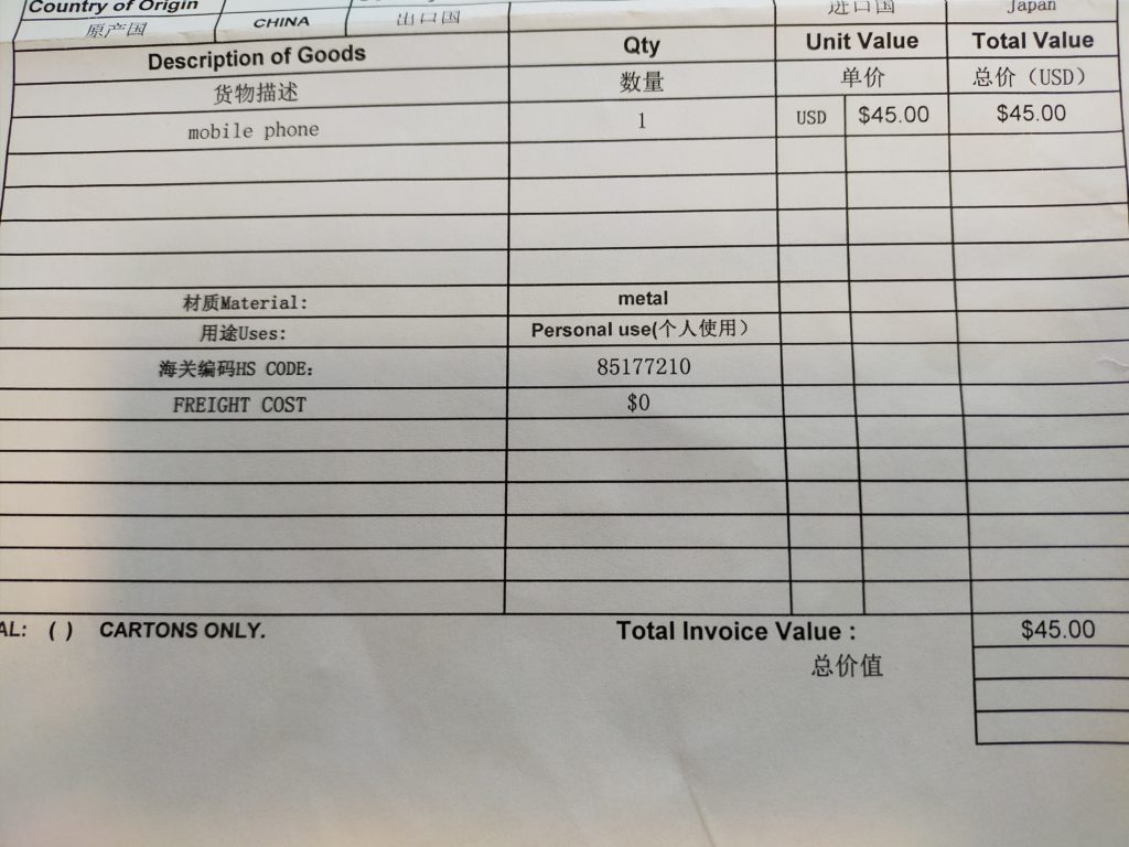 インボイスによれば、関税は45ドルと記載がありますが、個人使用なので0円だよとのこと。